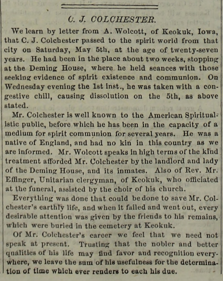 Charles J. Colchester também avisou Lincoln. Ele não era um amigo solícito ou tão preocupado quanto Swett ou Cole. Na verdade, Lincoln mal conhecia Colchester. Porém, ele era importante para Mary Todd Lincoln, a esposa do presidente, e tinha se tornado um visitante regular da Casa Branca. Curiosamente, esse personagem estranho, um espiritualista e um médium, era a única pessoa que Lincoln deveria ter ouvido. Colchester não precisava de nenhum de seus poderes proféticos para perceber que o presidente estava em perigo. Sua informação provavelmente veio das melhores fontes terrenas, seu amigo John Wilkes Booth.